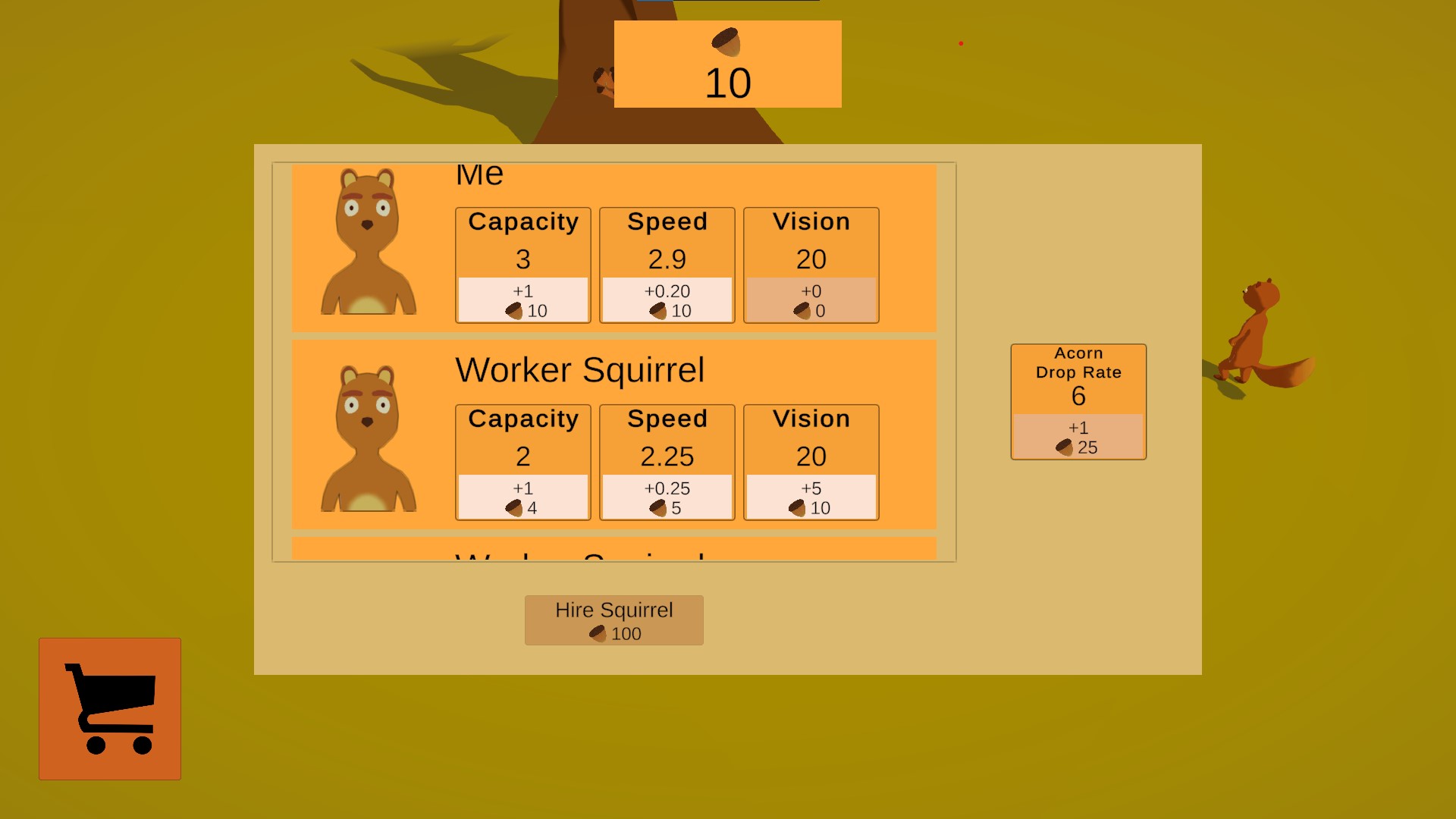 Tap/Click to move. Walk to an acorn to collect it, then walk back to the tree to deposit it to your stash. Use on-screen buttons to open the shop and upgrade yourself and all the workers on your payroll. Increase their carrying capacity, speed, and vision to increase their detection of acorns. Make sure to upgrade the acorn drop rate as well, else your workers might slack off with no work to do.